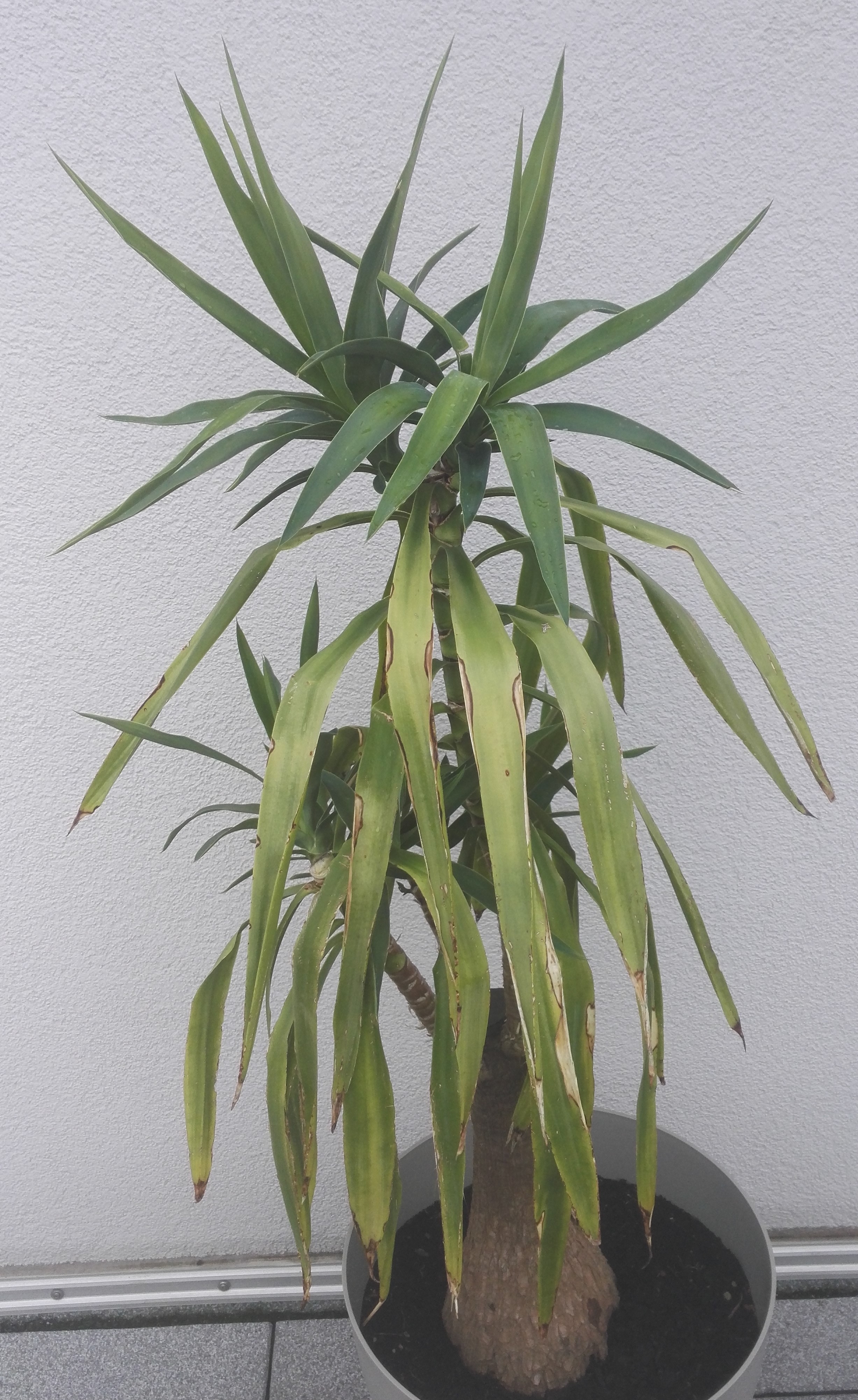 Ich hatte diese Yucca, die ich verkleinern wollte, habe sie geschnitten und die 3 schönsten Köpfe behalten und in Wasser gestellt. Nachdem ich sie tagsüber an den Balkon gewöhnt habe (südwesten, nur teilweise Schatten), stehen sie seit ca 2 Wochen durchgehend draußen.