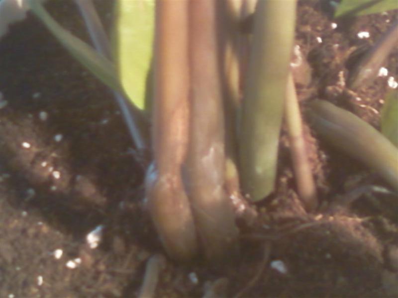 Die Stängel werden von Tag zu Tag weicher, die Pflanze kann nicht mehr aus eigener Kraft stehen, knickt ein und bekommt teilweise gelbe Blätter die sich gering ins dunkle bilden.