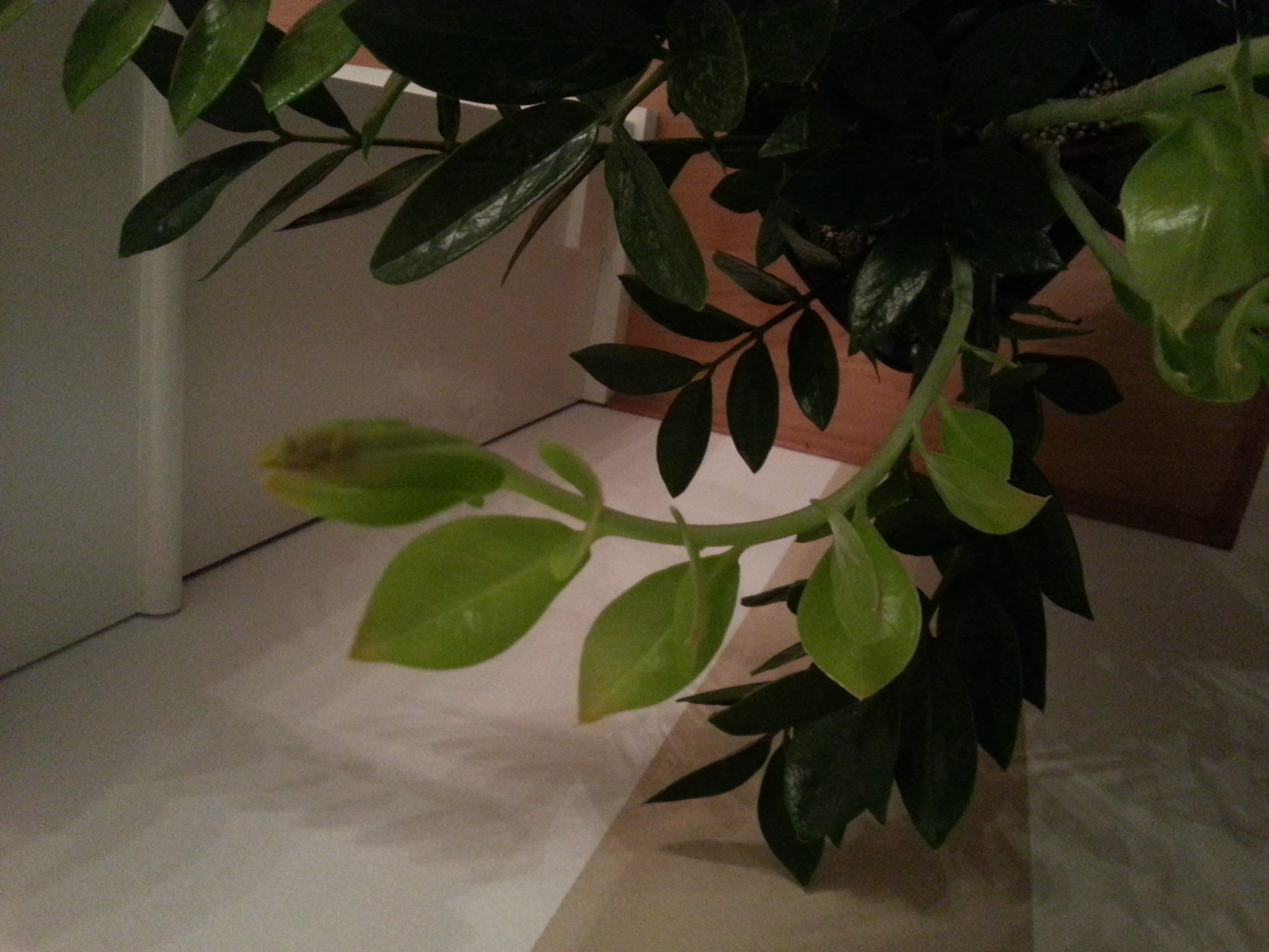 Hm, so einen ganz leicht gelblichen Touch haben die neuen Blätter meiner Zamioculcas auch. Das könnte daran liegen, dass die ganz neuen Blätter noch nicht so viel Chlorophyll haben bzw. noch nicht so dunkelgrün sind und darum gelblich erscheinen. Möglich ist es auch, dass das ein Mechanismus ist, um die neuen Triebe vor zu viel Sonne zu schützen.