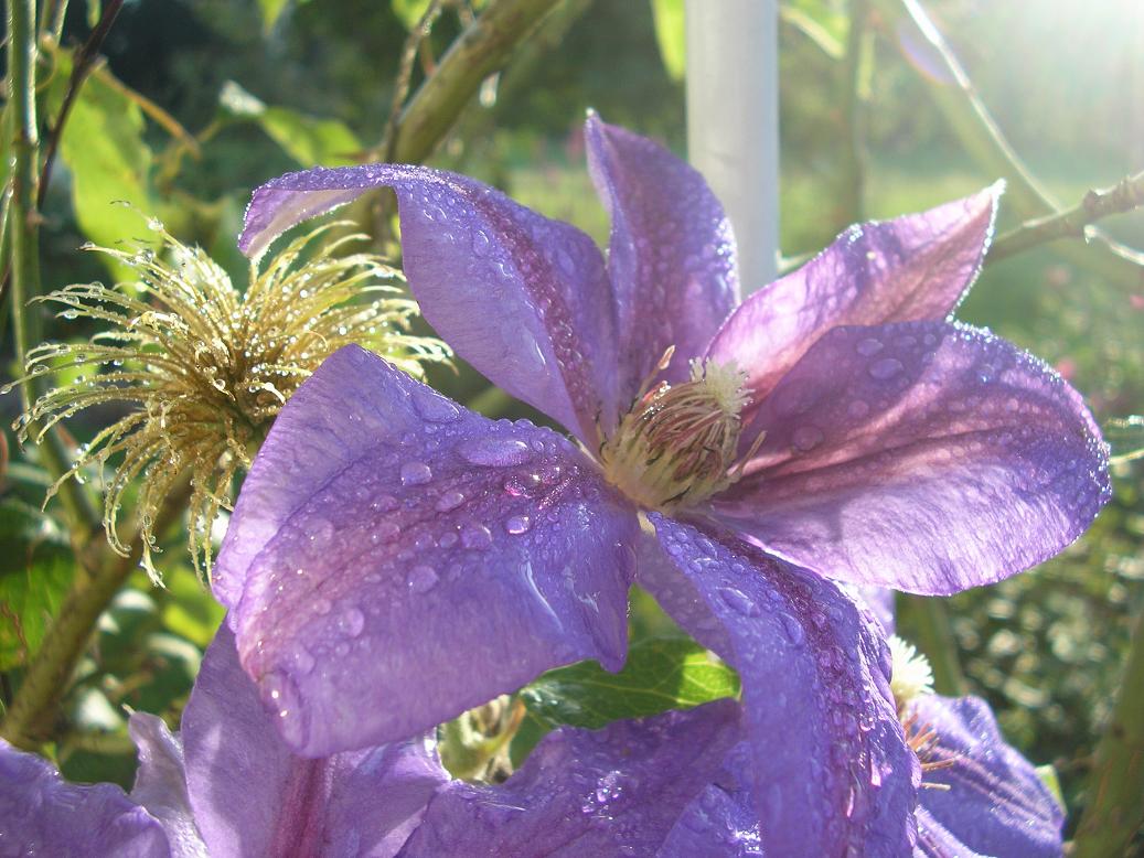 Hier eine meiner Clematis von denen ich leider keinen Namen weis. Sie trägt derzeit Früchte und Blüten gleichzeitig.