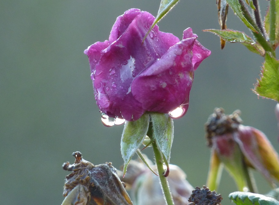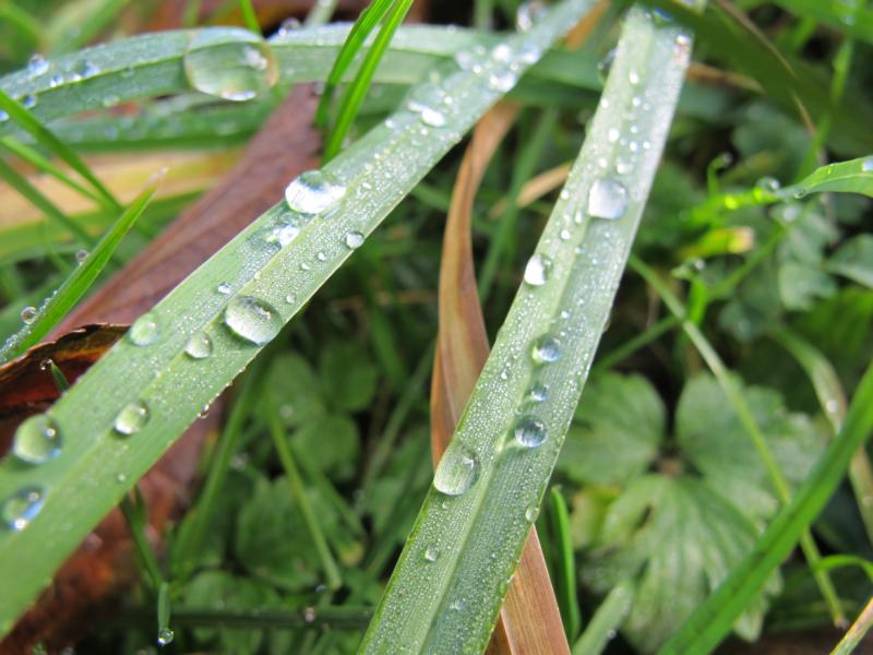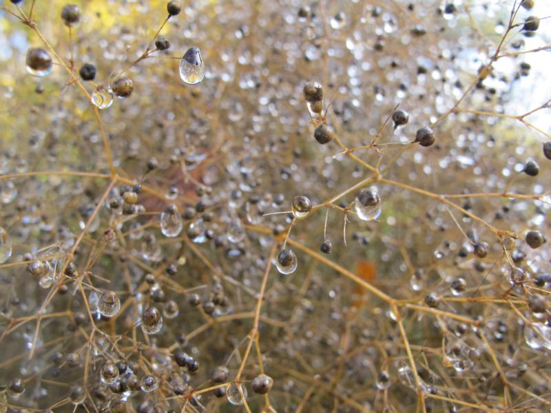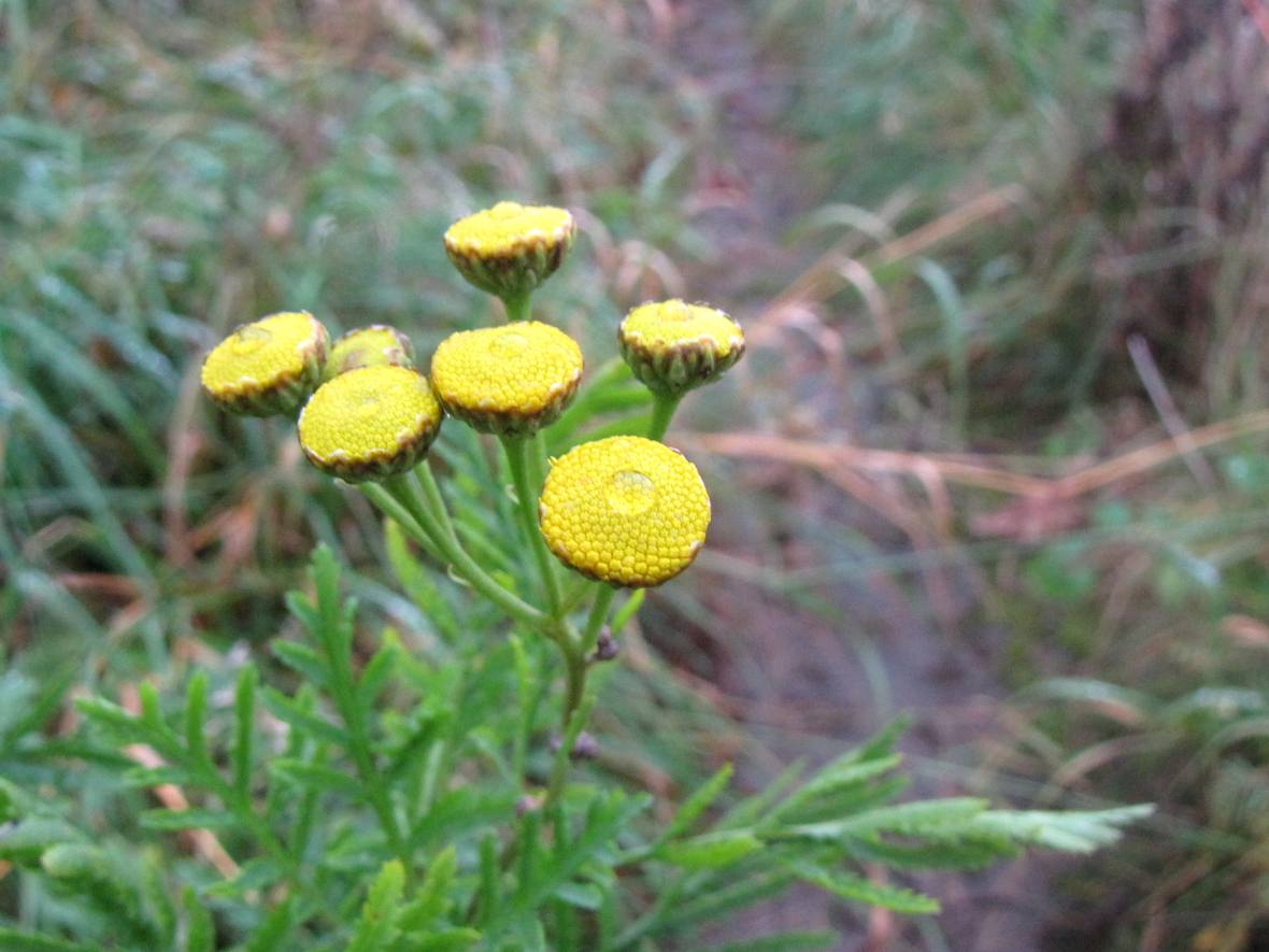 Der Rainfarn versucht noch einmal zu blühen. In der feuchten Witterung scheidet er wohl Tropfen in der Mitte der Blütenknospen ab wie andere Pflanzen an den Blatträndern (Guttation)