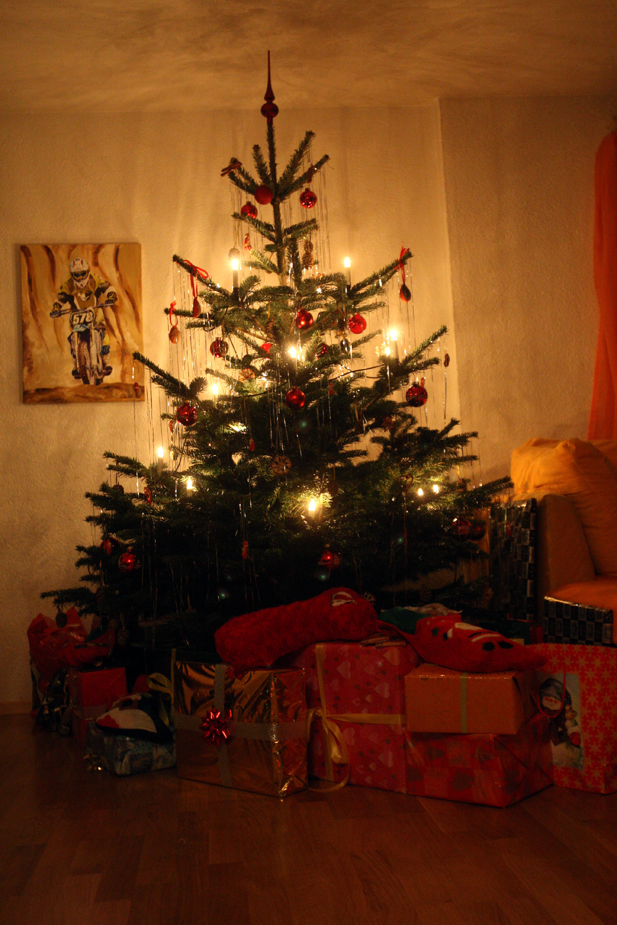 Hier ist ein Bild von unserem Baum. Wir hatten in der Hektik vergessen rechtzeitig einen zu besorgen und haben den vorletzten im REWE-Markt Straußfurt bekommen. Zum Glück, denn am 23.12.gab es weder im OBI. Hagebau- oder anderen Märkten in Erfurt einen zu bekommen.