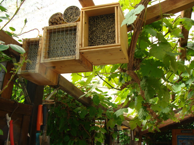 Wenn ihr auf das Insektenhotel achtet, seht ihr, wie die Bilder die beiden Seiten zeigen. Ich muss noch mal ein Panoramabild machen.