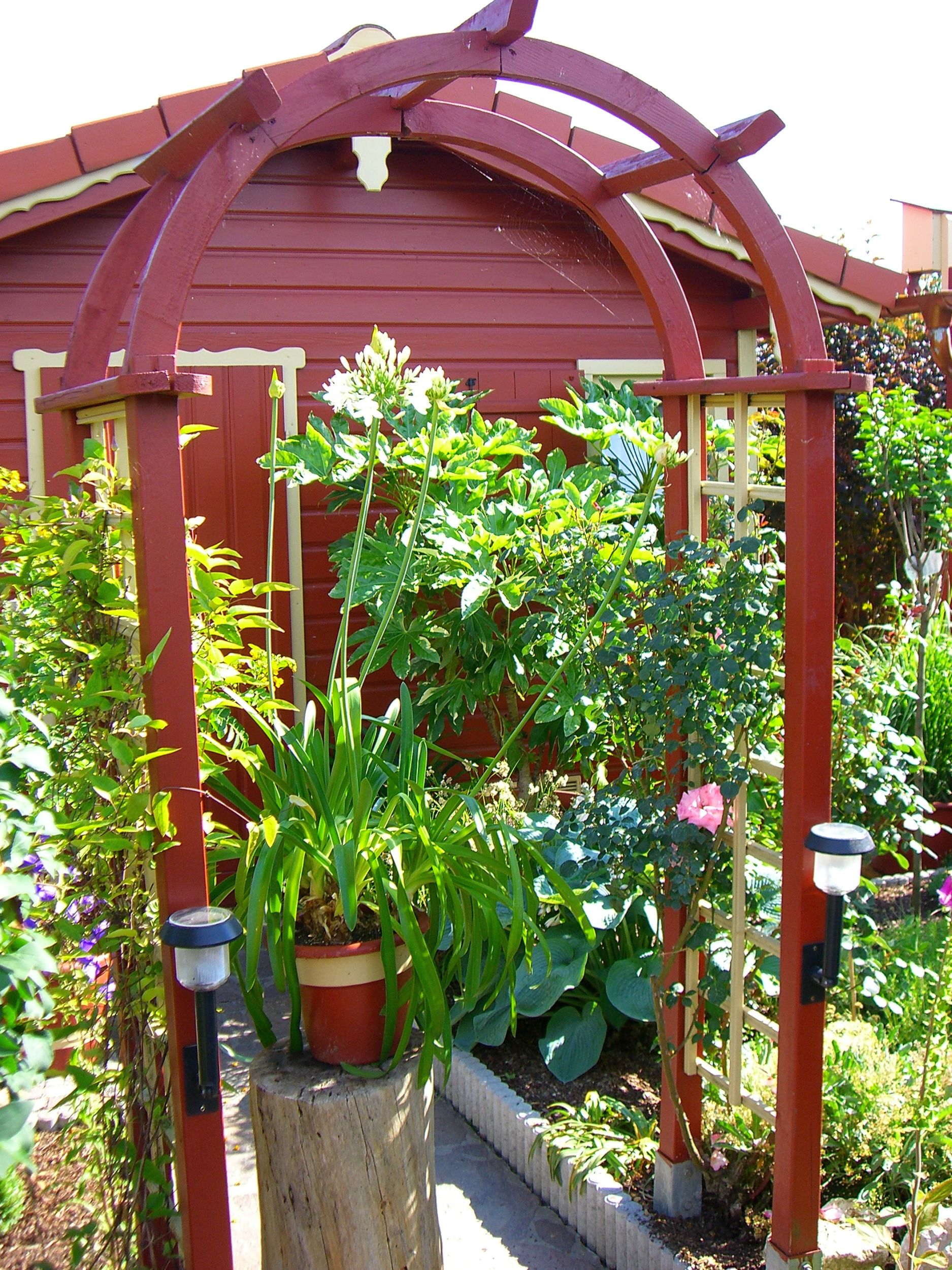 Also, ich hätte gerne für den Vorgarten die kleine Natursteinmauer von Rose, in das Beet dahinter den blau-lila Farbenmix von "registriertem Gast", hinten an der Terrasse Mel's Treppe und schließlich noch das Blätterdach und die kletternde Kiwi von Ichweißnichtmehrgenauwem.