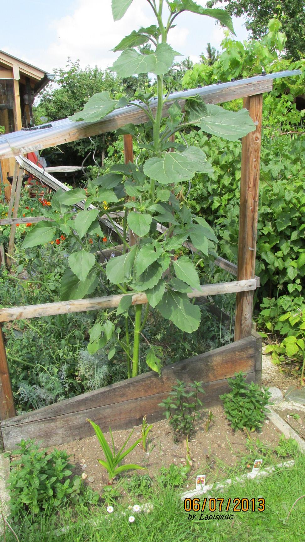 Das Riesentrum von Sonnenblume hat sich selbst im Tomatenhaus ausgesät. Meine anderen, mit roter Blüte, haben die Schnecken gefressen Nächstes Jahr schmeiß ich alles ins Tomatenhaus, soll doch werden was es wird