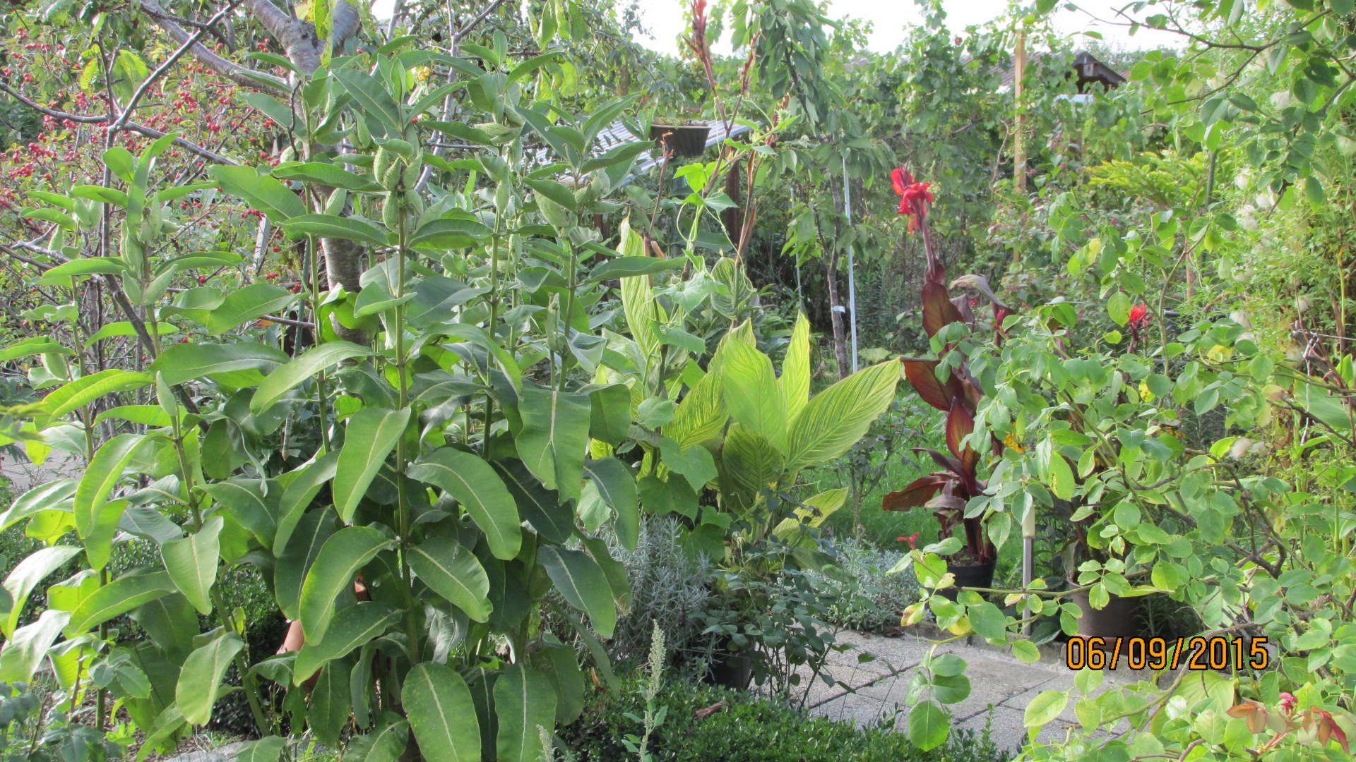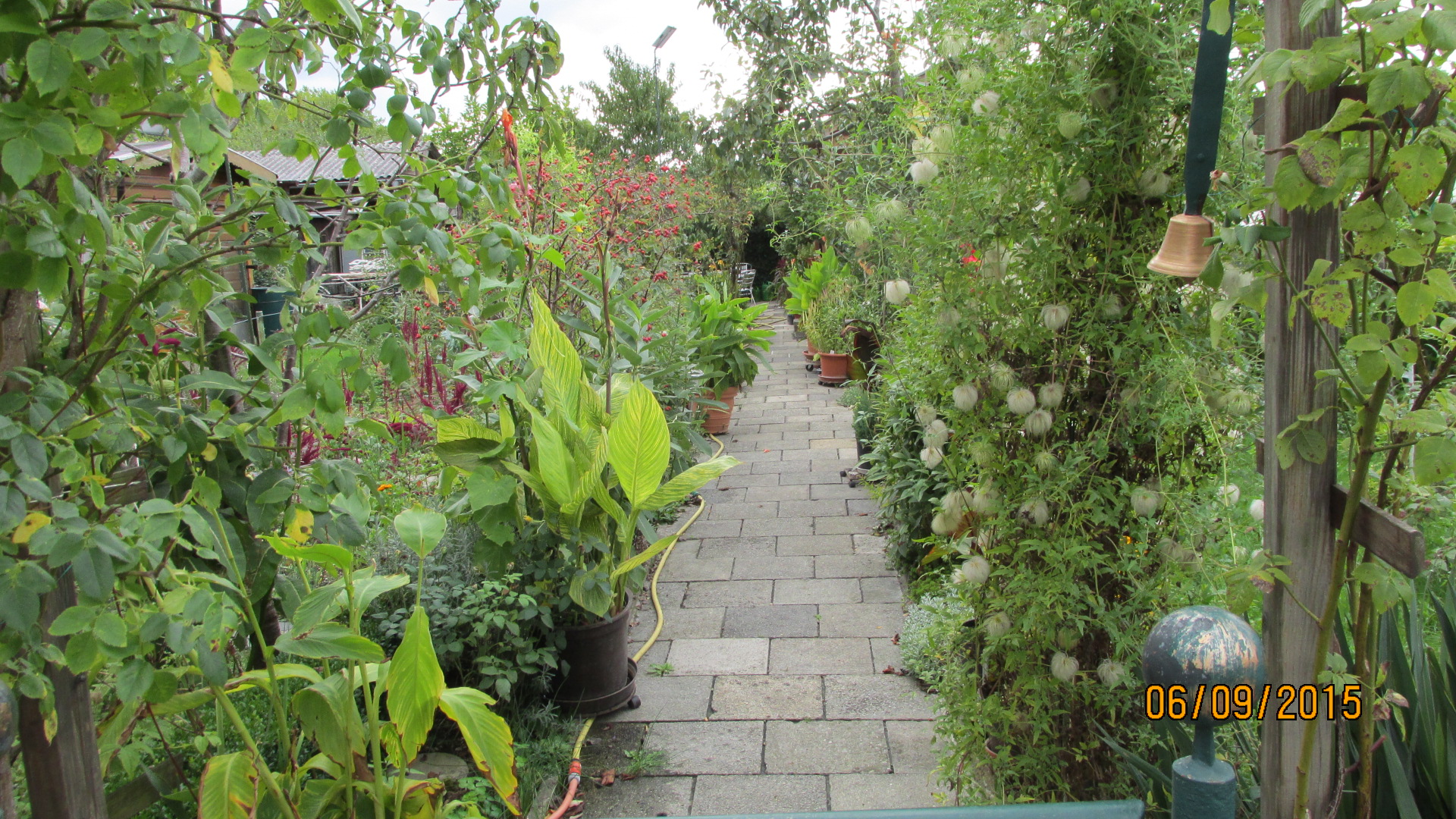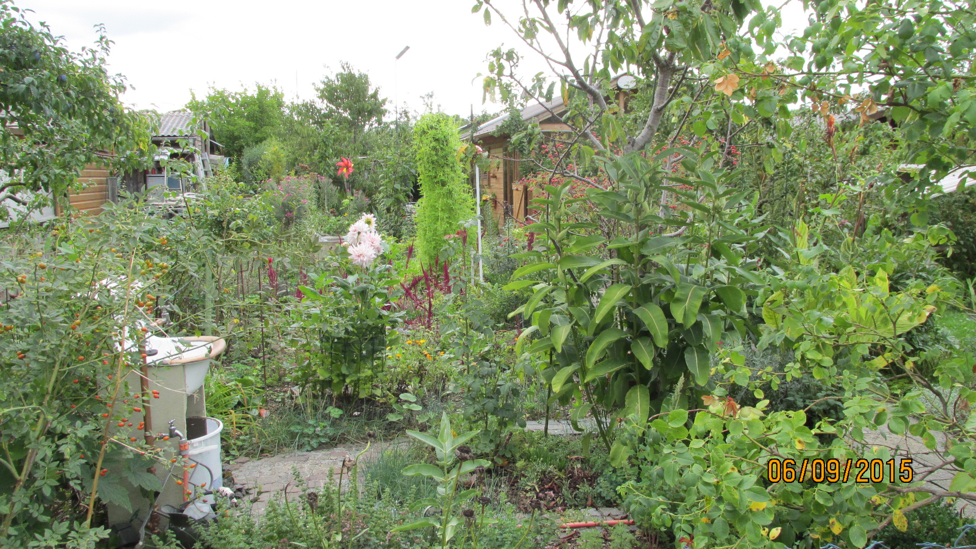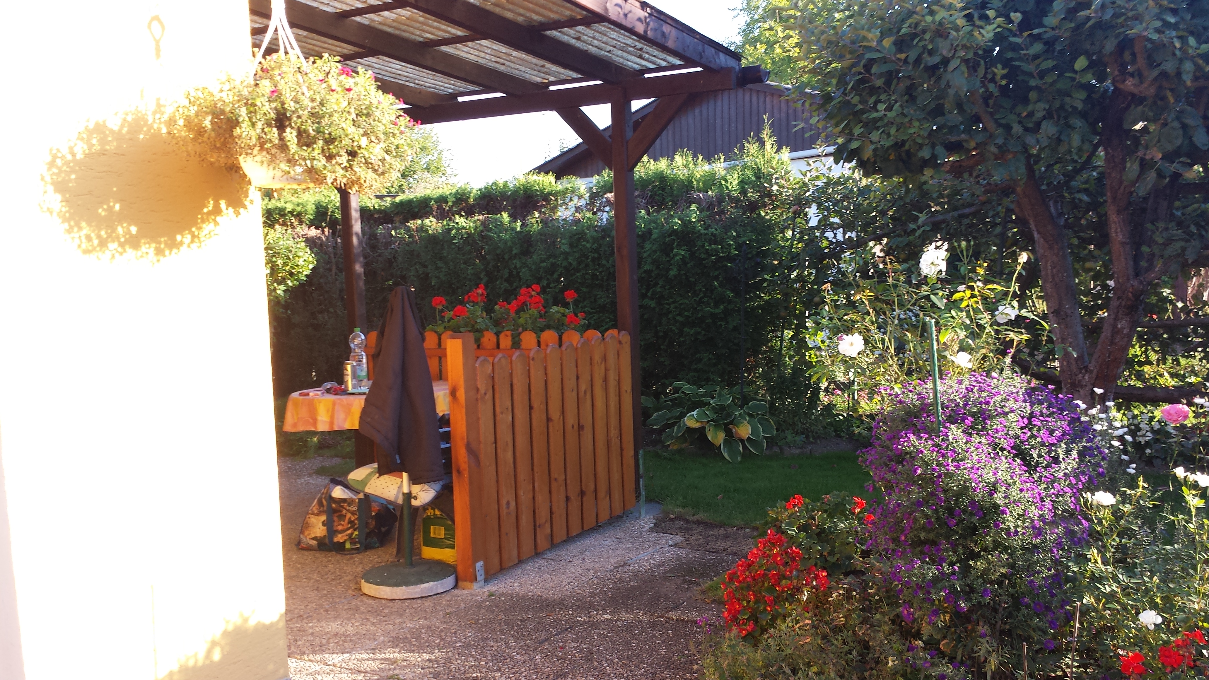Unser Garten in einem Kleingartenverein, man übersehe das Chaos und die Oleander sind für den kommenden Winter schon unters Dach gekommen und gegen Stürme gesichert und die Thuja Hecke mußte eingekürzt werden.