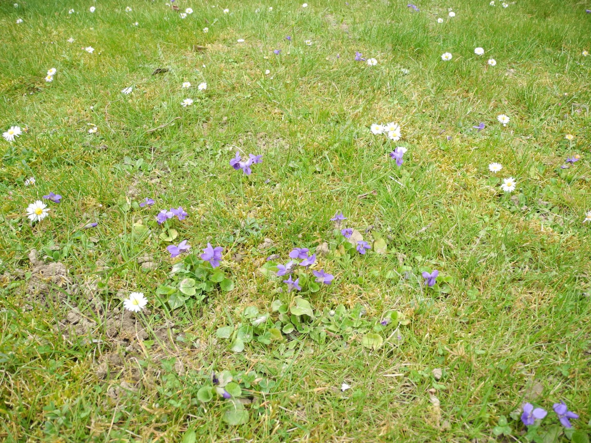 Die ehemals im Tuff gepflanzten Veilchen sind nun über die gesamte Wiese verteilt
