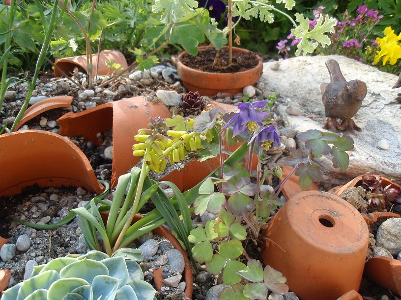 Ich habe zum Beispiel im Steingarten einen Bereich mit Tontopfscherben und einen mit Schrott eingericht.