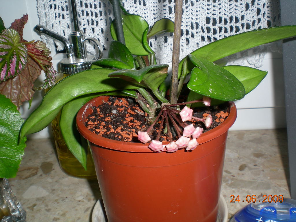 Manche Bilder zeigen die Hoya-Pflanzen an einer Rankhilfe hochgebunden - ich hab meine hängend!