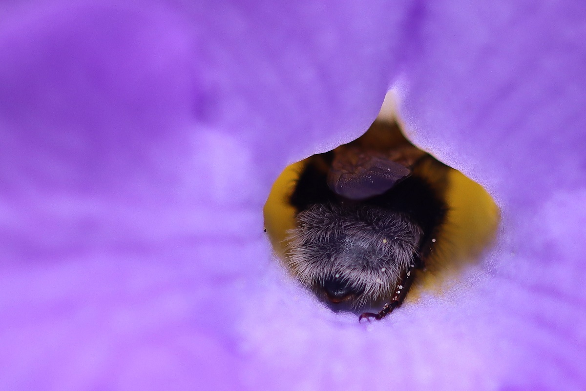 Hummel kriecht rückwärts aus einer Blüte.