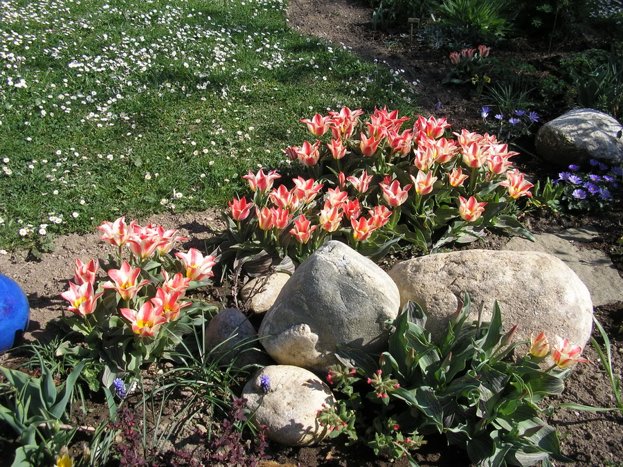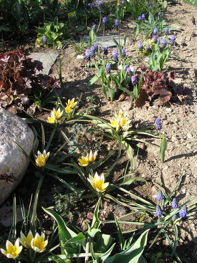 angrenzend an diese Stelle geht es ebenfalls mit Gruppen von Zwiebelpflanzen weiter. Da wäre einmal die gelbe Tulpia tarda, die fast wie ein Krokus anmutet und weis/rot- gestreifte Greigii- Tulpen.