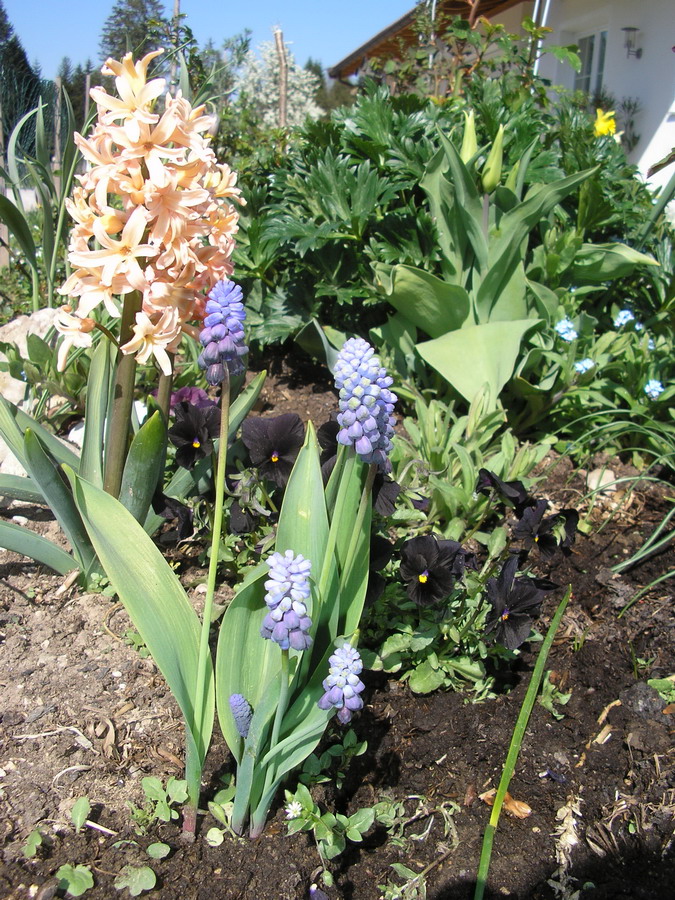 Eine kleine Zufallskombination die mir sehr gut gefällt, ist das schwarze Hornveilchen, zusammen mit apricotefarbenen Hyazinthen und blauen Traubenhyazinthen
