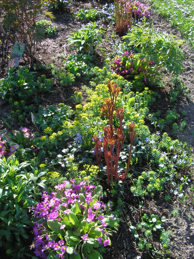 Im Pfingstrosenbeet weben zur Zeit Immergrün, Primeln und Wolfsmilch ihre Blütenteppiche zwischen den attraktiven rötlichen Austrieben der Staudenpfingstrosen. Die Strauchpfingstrosen sind schon knospig und eine wird bald einen Meter hoch sein.