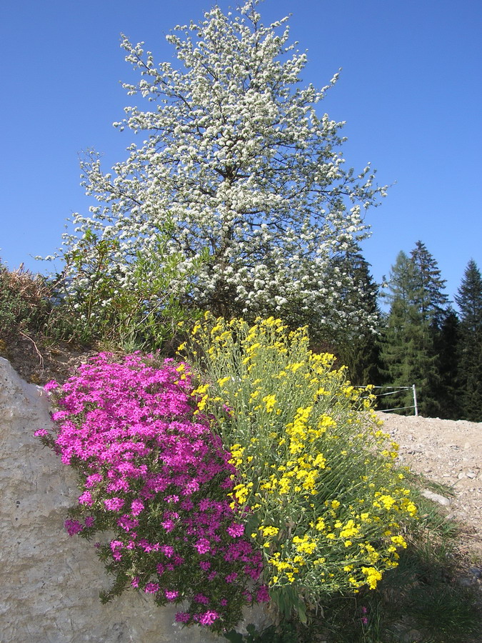 Hier blühen jetzt der Polsterphlox und der Duftsteinreich gerades sehr schön (Im Hintergrund Birnbaum)