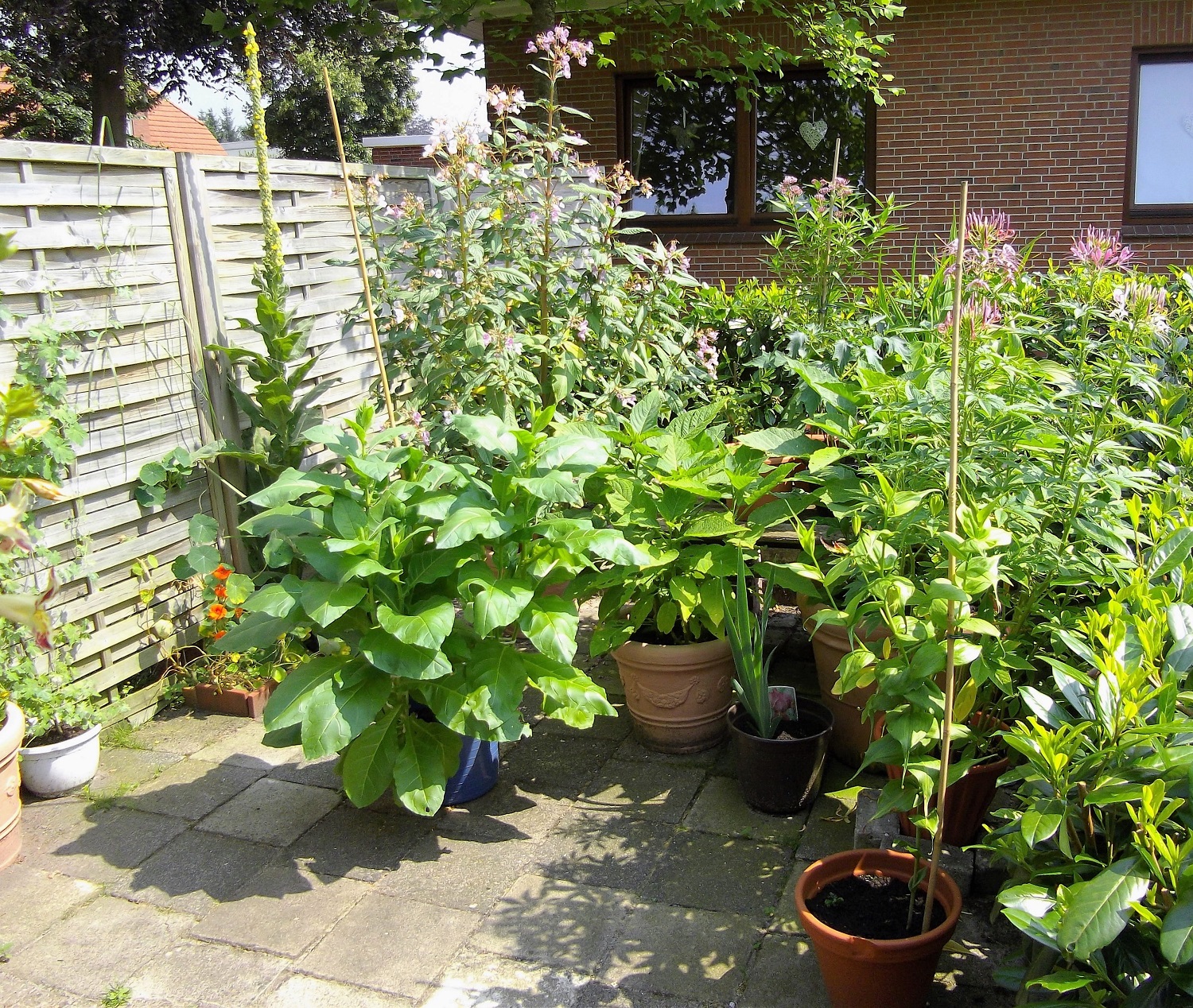 Zu sehen sind: 2 Brugmansia, Gloriosa, Tabakpflanzen, Spinnenblumen, eine Iris - die nicht so recht will dieses Jahr, auf dem Tisch im Hintergrund tummeln sich ein weißer Stechapfel (i mog die...aber nur zum Angucken ), Sumpf-Seidenpflanze, eine Zwergcanna, ausgesäte Stockrosen für nächstes Jahr, am Zaun eine Königskerze (die sich da selber ausgesät hat und gleich integriert wurde), Kapuzinerkresse (läusegeplagt...) und kanarische Kresse. Ganz vorne links lugt noch die Gauklerblume rein. Nun ja und drüsiges Springkraut als Kübelpflanze... - keine Panik: alle Samenkapseln werden - soweit möglich- unreif abgeknipst und was doch durchkommt im Frühling aus den Ritzen gezupft! Die Hummeln lieben mich dafür!