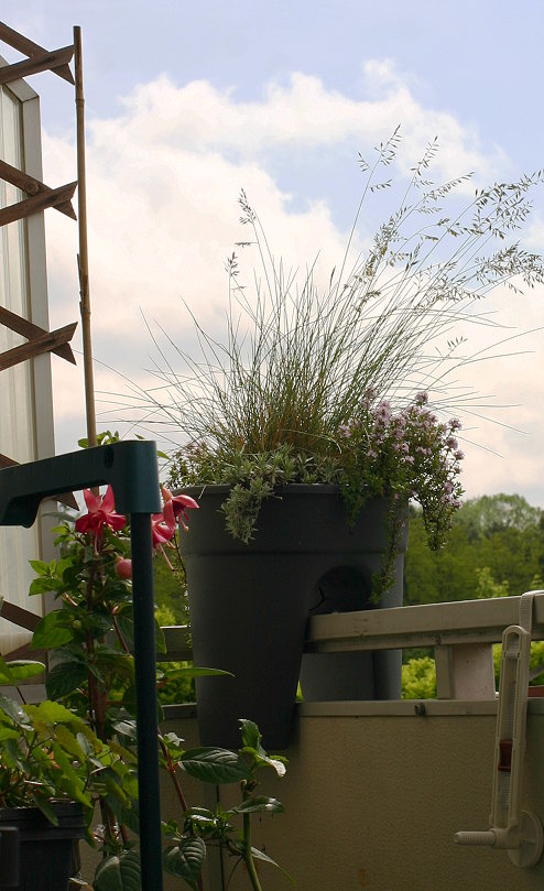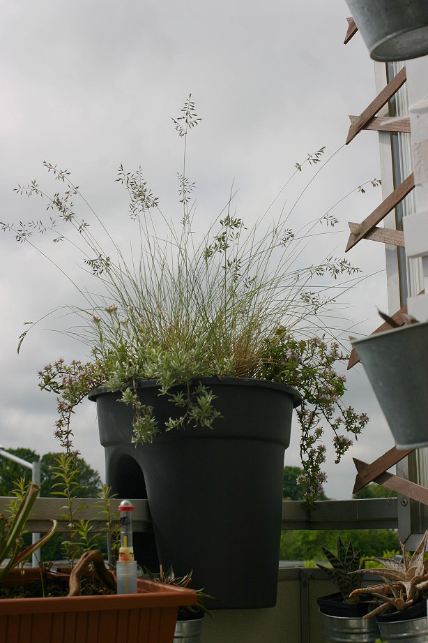 Ich versuch es seit letzten Sommer auch zum ersten Mal mit Stauden auf dem Balkon, in zwei Geländertöpfen (also eigentlich noch kleiner wie ein Kasten). Ich hab lange gesucht was die Wetterextreme auf dem Südbalkon am Geländer am besten aushält und mich am Ende für Blauschwingel, Kakskadenthymian und Katzenpfötchen entschieden. Über Winter hab ich die Töpfe vom Geländer genommen und an die Hauswand gestellt. Es hat alles ohne weiteren Schutz überlebt und blüht jetzt schön. Es sieht toll aus, wenn man mal von unten hochguckt und die Gräserblüten gegen den blauen Himmel sieht. Ich bin mal gespannt wie das auf die Dauer funktioniert.