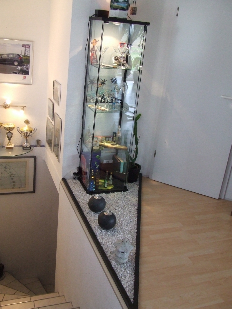 das ganze könnte auch unter dem motto: was passiert, wenn männer kies kaufen....... laufen. der weiße marmorsplit hatte es meinem schatz einfach angetan und so war die idee eines "steinfeldes" im haus bzw. wohnbereich geboren eine passende stelle war auch schnell ausgemacht: unser schwiegermutterfreundlicher abgang in den keller im eingangsbereich dass dort keine brüstung/geländer/ abtrennung o.ä. ist, ist so geplant, dort stellen wir meistens objekte, lichtinstallationen oder dekorierte elemente oder tischchen auf ....... je nach lust, laune und jahreszeit........ und jetzt eben ein feld aus weißem marmorsplit und schon wurde wieder ein plätzchen für eine meiner pitahayas geschaffen