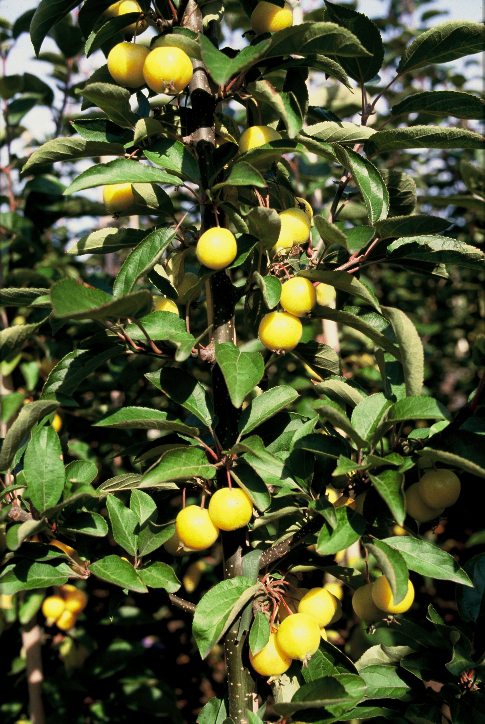 Die im Herbst in großer Zahl reifenden Früchte der Zieräpfel sind oft nur etwa zwei bis drei Zentimeter groß. Sie bleiben bei manchen Sorten bis weit in den Winter hinein an den Zweigen und fallen auch lange nach dem herbstlichen Laubfall noch auf. Für die heimische Tierwelt sind sie eine wertvolle Futterquelle in der kalten Jahreszeit. Im Frühjahr haben die reichblühenden Zieräpfel als Bienenweide eine große Bedeutung. Die Farbpalette der kleinen Äpfel umfasst die unterschiedlichsten, oft intensiv leuchtenden Gelb-, Orange- und Rottöne. Zieräpfel sind nicht nur im Garten sehr attraktiv, Zweige mit Früchten werden auch gerne für floristische Zwecke verwendet und einzelne Äpfelchen eignen sich zum Beispiel gut als Tischdekoration. Auch wenn diese Äpfelbäume vor allem wegen ihres Zierwertes gepflanzt werden - die kleinen Früchte sind essbar und können unter anderem zu feinem Gelee verarbeitet werden. In England und Amerika werden sie schon seit langem für kulinarische Zwecke verwendet. Doch dafür sind die kleinen Äpfel eigentlich viel zu schön ....