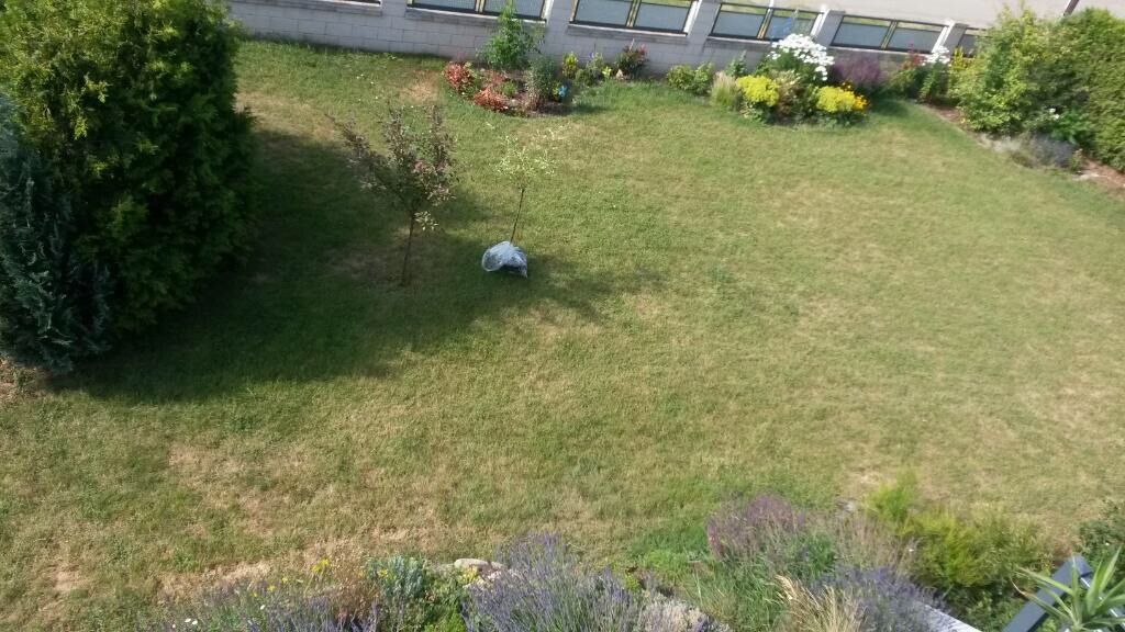 Achja, noch Randdaten: hinter den Thujen (linker Rand des Bildes) ist unsere Einfahrt, rechts ist das Nachbarhaus und das Foto wurde von der Terrasse aus aufgenommen.