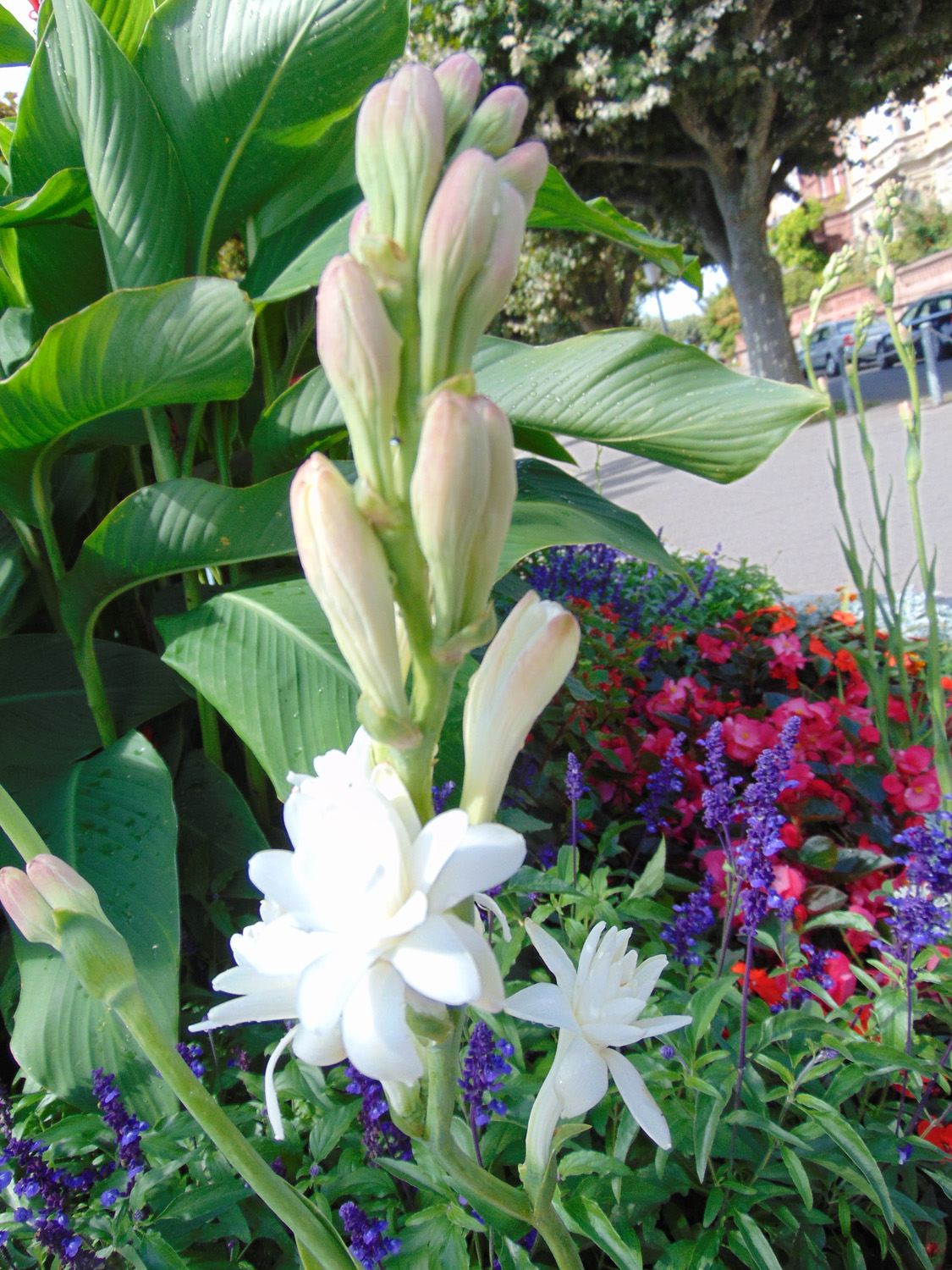 Kennt jemand die hier abgebildete Zierpflanze, die ich kürzlich auf einer Blumenrabatte in ihrer weißen Pracht bestaunt habe? Auf dem dritten Bild sind ihre Blätter links neben der rotblühenden Impatiens zu sehen.