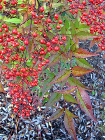 Die ersten beiden Fotos zeigen hier einen ca 1 m hohen Zierstrauch mit roten Früchten von ca 5 mm Durchmesser und 1-4 weißen Kernen in ihrem Innern. Zuerst dachte ich an einen Sambucus racemosa. Die glattrandigen Blätter und der rispige Fruchtstand sprechen aber dagegen. Weiß jemand von Euch Gärtnern den Namen dieses schönen Spätherbst-Farbenspiels?
