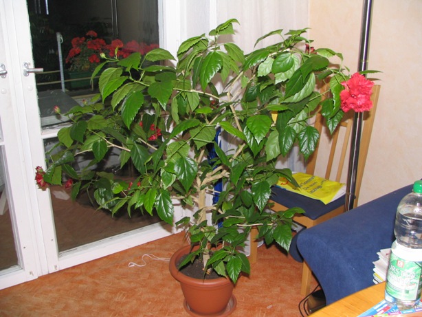 Ich habe mal überlegt, der Hibi muss älter sein. Ich tippe mal auf gekauft 1990 oder 91, weil das die erste Pflanze war, die ich fürs Haus gekauft habe