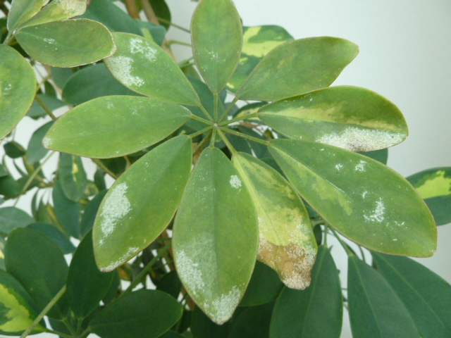 Ist das ein Pilz auf der Ober- und Unterseite der Blätter? Zum Teil ist auch die Erde grau, bekommt aber nur 1 Mal pro Woche Wasser, zu feucht kann es doch nicht sein?