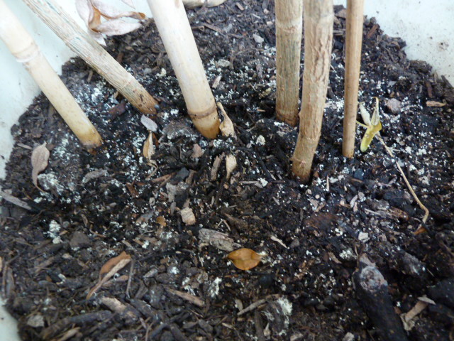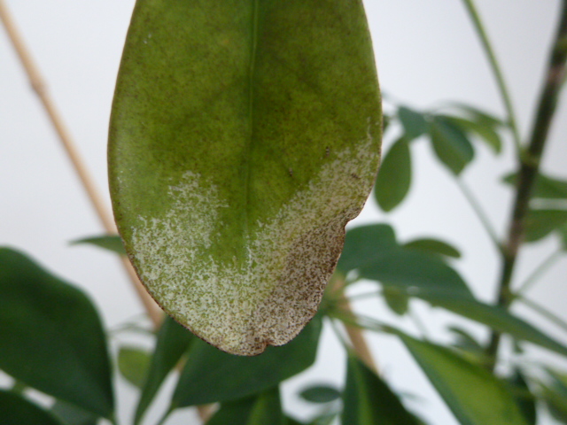 Ist das ein Pilz auf der Ober- und Unterseite der Blätter? Zum Teil ist auch die Erde grau, bekommt aber nur 1 Mal pro Woche Wasser, zu feucht kann es doch nicht sein?