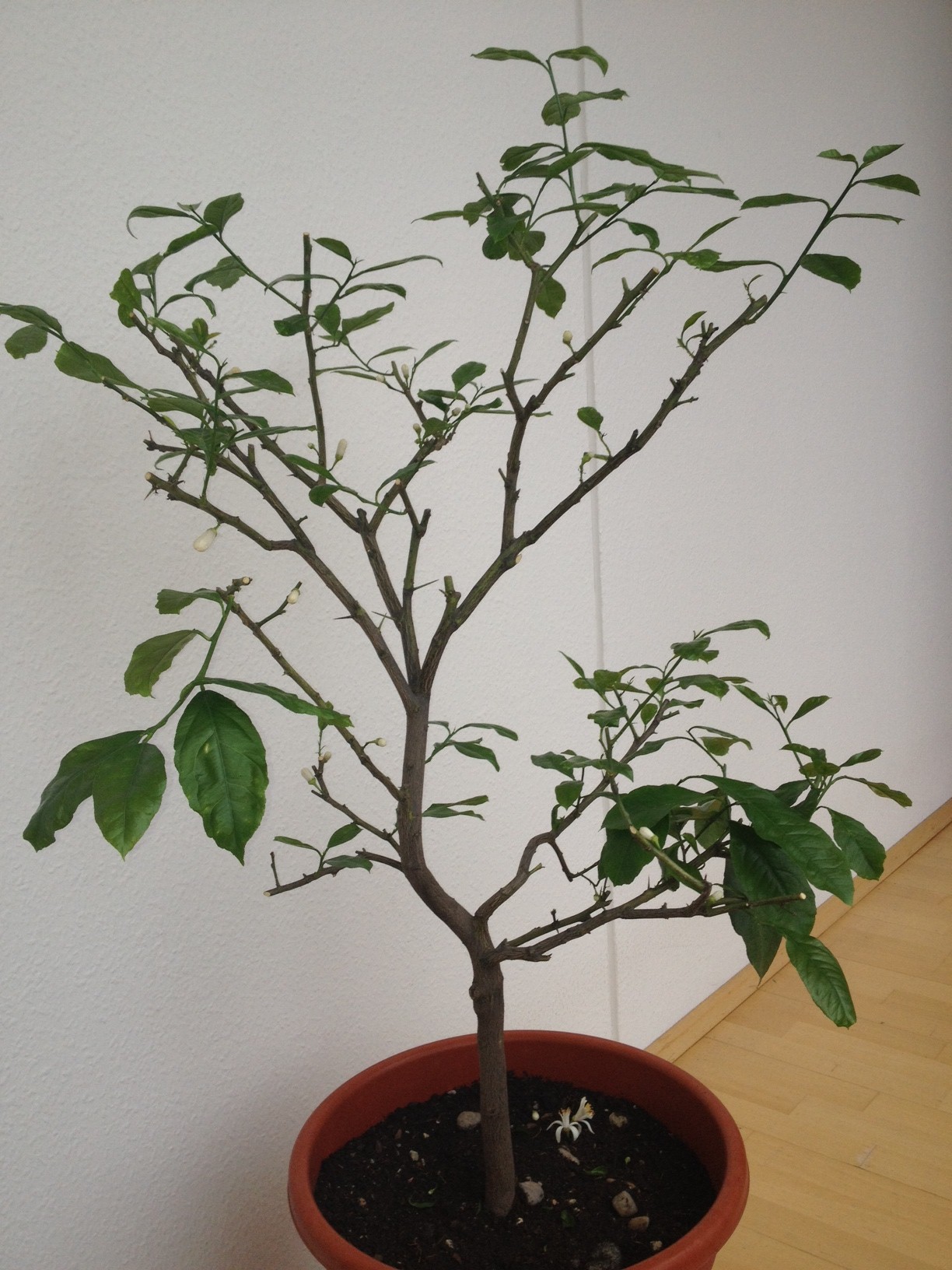 Ich hab die Zitrone noch nicht geduengt und gebe ihr momentan kleine Mengen Wasser 2-3x/Woche. Noch steht sie in der Wohnung, da nacht immer noch Minustemps sind und sie schon Blueten hat. An den kuehlen Platz wollte ich sie nicht nochmal stellen, da sie letzten Winter dort auch schon die Rote Spinne aufgesammelt hat.