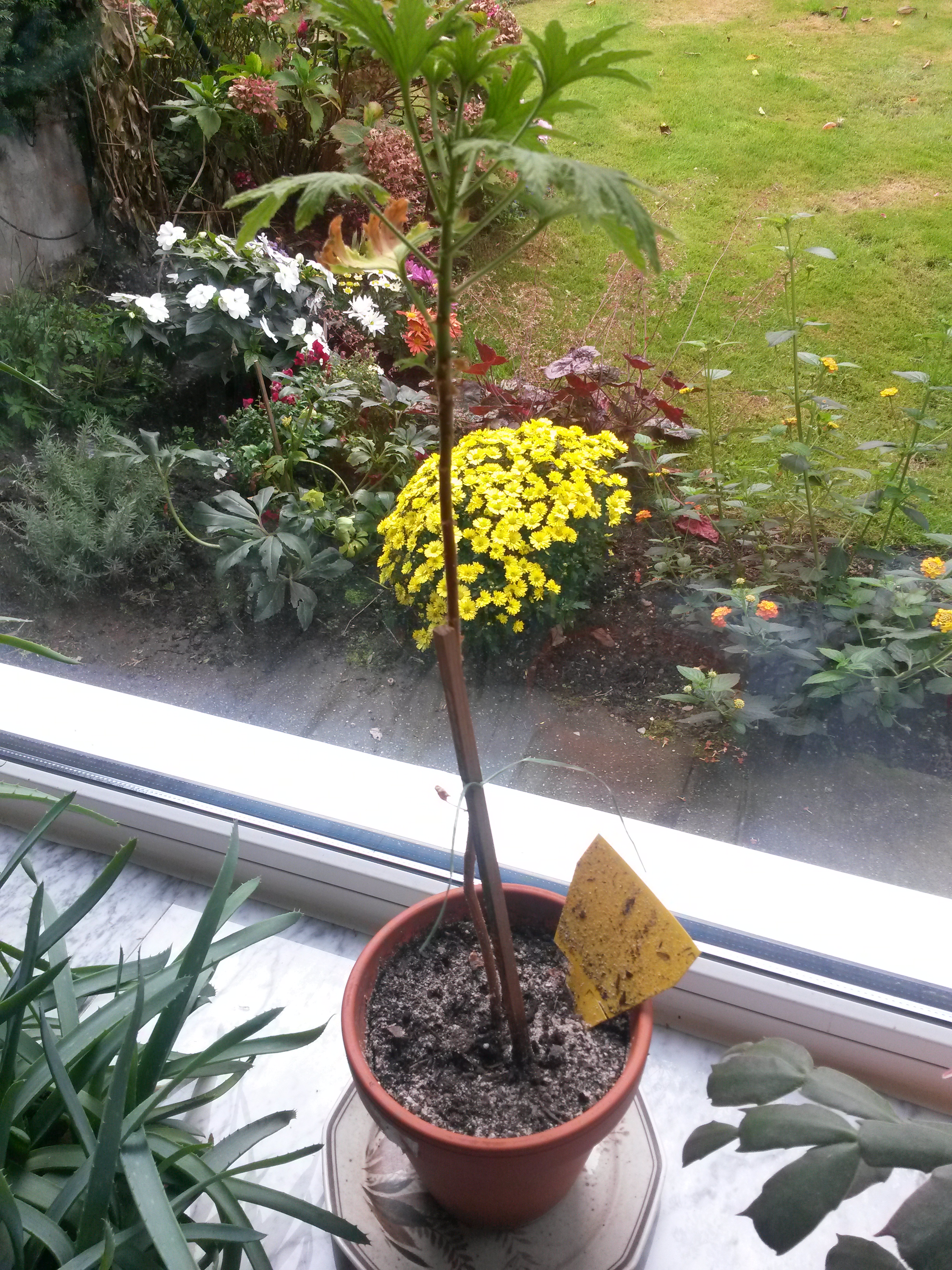 Nun wuchert die gute leider in der Gegend rum. Mittlerweile ist sie ein ca. 40cm hohes Stämmchen, hat aber bis auf die oberen 10cm alle Blätter verloren. Zwischendurch haben sich am Stamm wieder kleine neue Blätter gebildet, die sind aber leider sehr schnell geld geworden und abgefallen. Das war zu der Zeit als es sehr viel geregnet hat und draußen kühler geworden ist. Deswegen hab ich sie zu dem Zeitpunkt dann wieder in die Wohnung geholt. Sie steht auf der Fensterbank eines Panoramafensters und bekommt absolut viel Licht den ganzen Tag. Mit dem Gießen übertreibe ich es M.E. auch nicht...