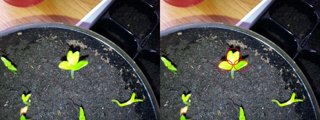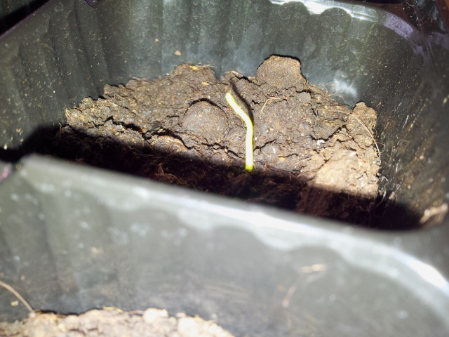 Die Drillinge wachsen zusammen deutlich langsamer, um sie zu vereinzeln, ist es aber noch deutlich zu früh, sie sind sowieso mit den Kernstückchen teilweise miteinander verbunden und abbrechen mag ich nicht. Sie ragen etwa 2cm aus dem Boden. Sie sind auch unterschiedlich gut entwickelt. B5 hingegen passt bald nicht mehr ins Streichholzgewächshaus, hat jetzt gute 4 cm. Ich denke mit dem Zwilling wird sie vielleicht etwas langsamer werden.