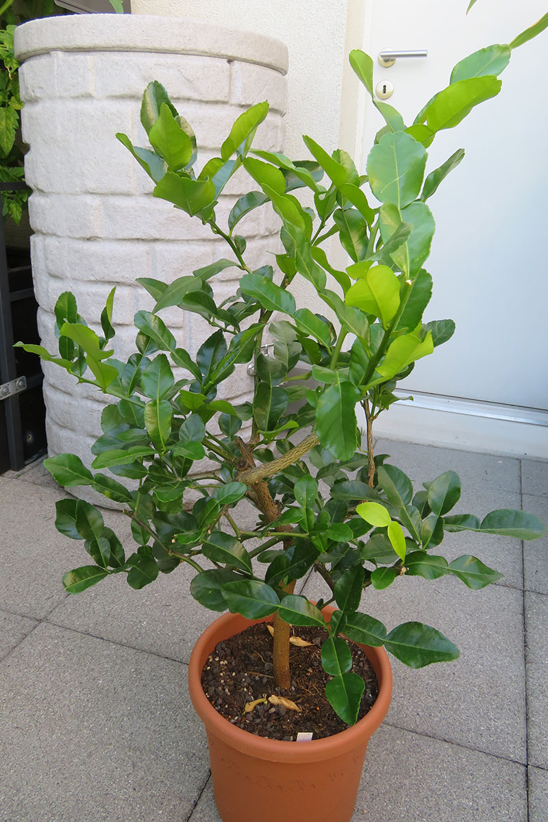 Zwei meiner Citrus-Pflanzen – eine Limequat ‘Eustis’ und eine Kaffirlimette – habe ich im Frühling stark zurückgeschnitten, da sie einerseits irgendwie von Haus aus zu sperrigem Wuchs neigen und andererseits auch einfach schlecht überwintert waren. Milben hatten insbesondere der Limequat zugesetzt. Da beide nicht zu meinen grossen Favoriten zählen, möchte ich sie künftig generell eher klein und kompakt halten.