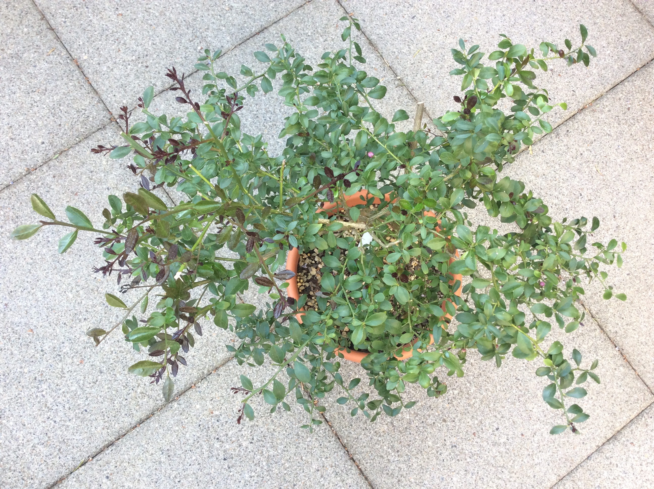 Ich habe heute nach reiflichem Überlegen die Eisenhut-Fingerlimette zurechtgestutzt. Die wuchs sehr einseitig, mit einem sehr kräftigen Trieb, den ich zwar schon immer zu bremsen versucht hatte. Nun habe ich diesen fast komplett rausgeschnitten (oben etwas rechts der Mitte), womit das Pflänzchen hoffentlich endlich symmetrischer wächst …