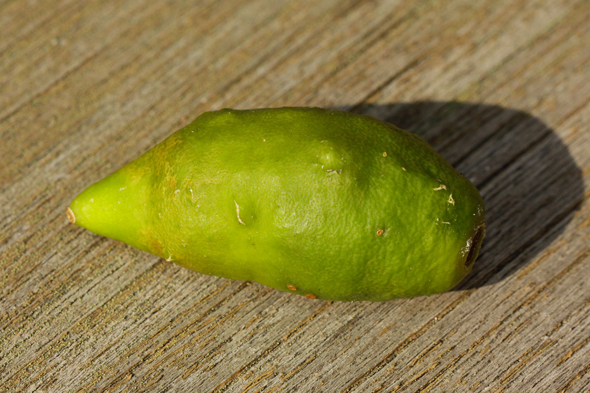 Der Schalenduft erinnerte mich wieder an Mandarine. Das noch trockene Fruchtinnere hingegen hatte etwas von Lima, also Richtung parfümierte Limette … Seltsame Kombination! Auf jeden Fall bin ich mittlerweile fast überzeugt, dass Zedrate in dieser Kreuzung stecken wird: die riesigen, weissen Blüten, die eher dünnen, länglichen Blätter mit gekerbtem Blattrand, die recht derben Früchtchen – und heute entdeckt, teilweise stempellose Blüten. Nun, es bleibt spannend!