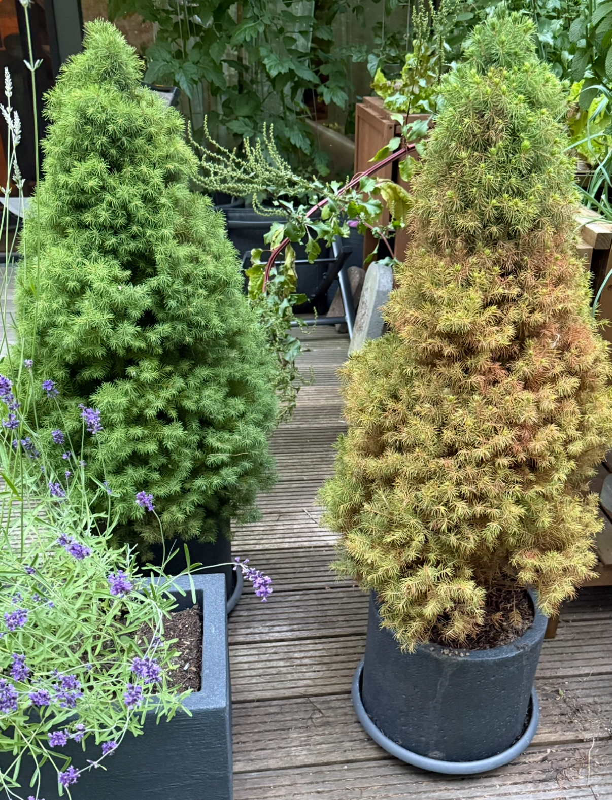 Es geht um 3x 3jährige Zuckerhutfichten im Topf mit praller Südausrichtung im Norden Deutschlands mit reichlich Wind. Sie wurden mäßig - großzügig gegossen- Staunässe kann ausgeschlossen werden. Habe eine probeweise ausgetopft: Wurzeln sehen toll aus, alles war feucht und kein Schimmel oder Ähnliches.