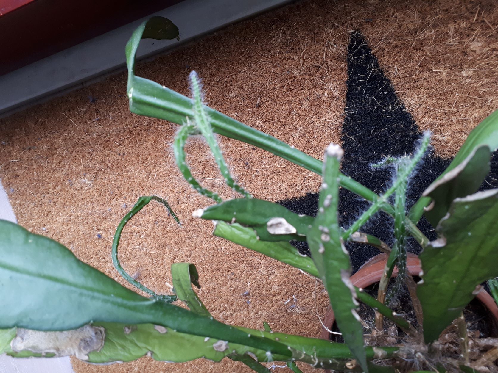 Meine Problemkinder sind zwei ältere Blattkakteen (keine Ahnung was genau). Diese habe ich zusammen mit anderen Pflanzen aus dem Haushalt des verstorbenen Onkels meines Mannes übernommen, um sie vor dem Kompost zu retten. Sie standen beide vermutlich im Sommer immer draußen, es gibt viele, wenn nicht fast nur, Blätter mit Fraßspuren. Der Onkel hat sie sicher nicht besonders gepflegt. Die Töpfe sind sehr, sehr klein. Man sieht unten viele verholzte abgeschnittene Stämme. Die älteren Blätter wirken zudem teils schrumpelig. Die Kakteen haben während des Sommers neues Grün hervorgebracht, allerdings sieht es anders aus als die vorherigen Blätter: dünner (eher rund statt flach), bestachelter und mit Luftwurzeln.
