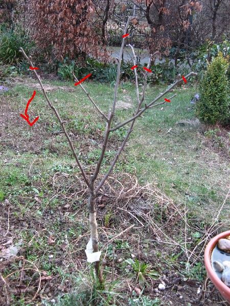 Irgendwie kommen mir besonders die Zwergäpfel so vor, als wenn sie von Anfang an nicht richtig geschnitten worden seien. Es fehlt z.B. m.E. der höhere Mittelstamm und die Abzweigungen sind doch zu steil oder? Also: Schnitt oder nach unten (45°-Winkel) biegen? Oder doch lassen?