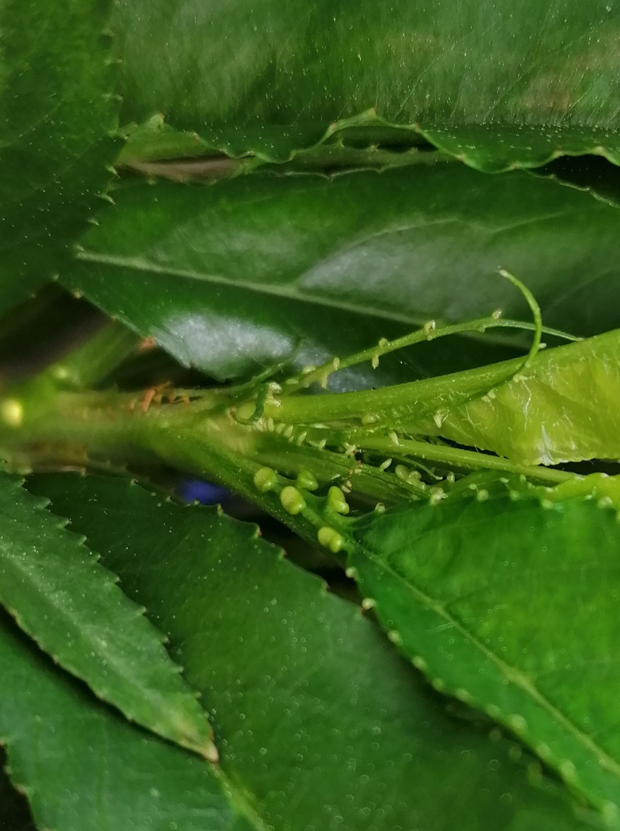 Hallo! Mein Zwergpfirsich entwickelt sich im Balkonkasten prächtig und hat tausende von satten, grünen Blätter. Leider entdecke ich die klebrige Spuren von Blattläusen und munter krabbelnde Ameisen. Bei Untersuchung der Blätter und Triebe finde ich winzige grüne Kokons die ich nur schwer von der Pflanze trennen kann. Die Dinge sind hart wie Steine. Weiss jemand was das ist?