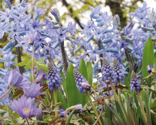 Blau ist eine mystische, kühle Farbe, die in der Literatur für Ferne und Sehnsucht steht. Blau wird aber auch eine emotional ausgleichende, beruhigende und mäßigende Wirkung zugeschrieben. In der Welt der Blumenzwiebeln finden sich viele blaue Sorten. Reine Blautöne gibt es z.B. bei Traubenhyazinthen: Von der tiefblauen Muscari latifolium bis zur hellblauen Muscari ´Valerie Finnis´. Eine weitere blaue Zwiebelblume ist die Amemone ´Blue Shades´, die besonders gut zwischen crèmeweißen Tulpen wirkt. Um eine flüchtige Duftspur durch den Garten zu legen, kann man aus dem blauen Hyazinthensortiment wählen.