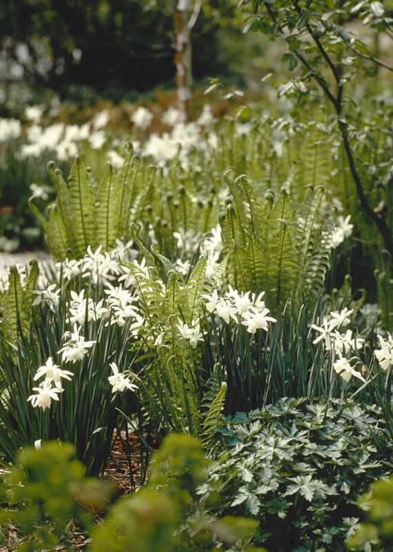 Werden gleichzeitig blühende Stauden und Gehölze mit Blumenzwiebeln kombiniert, können sich die Pflanzen gegenseitig in ihrer Wirkung verstärken. Aufgrund der großen Farbenvielfalt bei Zwiebelblumen finden sich leicht Sorten, die gut mit den im Beet vorherrschenden Farben harmonieren, so dass stilvolle Kreationen Ton-in-Ton entstehen. Auch starke Kontraste sind möglich: Weiß oder gelb blühende Narzissen kommen z.B. gut vor dunkellaubigen, immergrünen Gehölzen wie Buchsbäumen zur Geltung und sind ideal, um dunkle Gartenbereiche zu beleben. Stauden können die Farbwirkung von Zwiebelblumen ebenfalls intensivieren: Niedrig wachsende Stauden mit großen, grünen Blättern eignen sich ausgezeichnet als ruhiger Hintergrund für die farbenfrohen Zwiebel- und Knollengewächse. Der Frauenmantel (Alchemilla mollis) mit seinen großen Blättern z.B. lässt sich gut mit Goldlauch (Allium moly) und Narzissen kombinieren. Die weiß bis zartgelb blühende Narzisse `Ice Follies` passt auch ausgezeichnet zu der Großen Blaublatt-Funkie (Hosta sieboldiana `Elegans`). Diese Pflanzenpartnerschaften sind nicht nur farblich interessant, sie bieten zudem den Vorteil, dass die frisch ausgetriebenen Stauden die nach der Blüte vergilbenden Blätter der Zwiebelblumen verdecken. Kleinblättrige, bodendeckende Stauden können ebenfalls reizvolle Partner sein. Ein apartes Bild ergeben beispielsweise die cremefarbenen Blüten von Crocus chrysanthus `Cream Beauty` zusammen mit den rötlichen Blättern des Stachelnüsschens Acaena microphylla `Kupferteppich`.