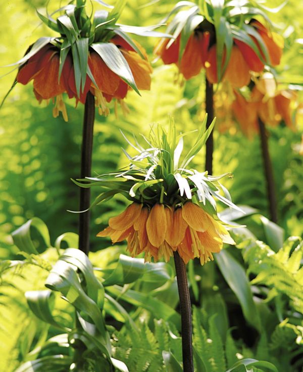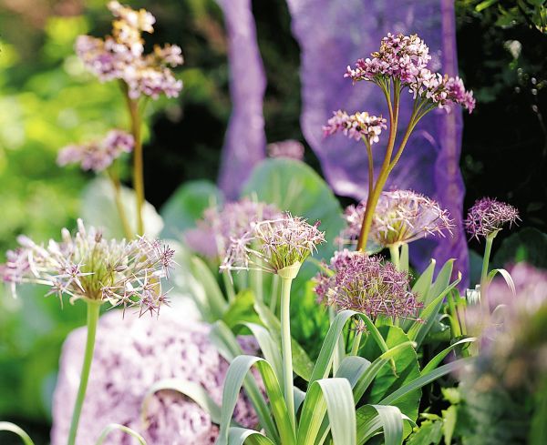 Leuchtende Blüten vor grüner Kulisse Auch Stauden mit großen grünen Blättern, kleinblättrige Bodendecker oder Farne mit ihrem grünen Blattwerk eignen sich gut als Begleiter für Blumenzwiebeln und Knollen. Sie bilden einen ruhigen Hintergrund, vor dem die intensiven Blütenfarben von Tulpen, Narzissen und Co. besonders stark leuchten. Weiße oder gelbblühende Zwiebelblumen sind bestens geeignet, um dunkle Gartenbereiche zu beleben. Neben dem Spiel mit Farben bietet sich auch das Gestalten mit markanten Formen an: Einige Zierlaucharten und -sorten wie z.B. Allium `Purple Sensation` haben kugelrunde Blütenstände. Diese Zwiebelblumen sind ideal, um im Mai und Juni im Staudenbeet außergewöhnliche Akzente zu setzen.